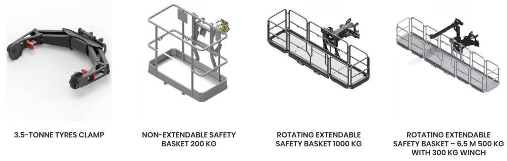 An R.F.ID automatic attachment recognition system is fitted as standard to all models in the RTH range installed on the boom head. When the attachment is coupled to the machine, it is recognised automatically. Thanks to its reduced weight, the new quick-fit system offers improved lifting capacity.Magni Telehandlers make use of a variety of attachments including, EWP Baskets ( elevated Tyre handlers Winches Forestry kit